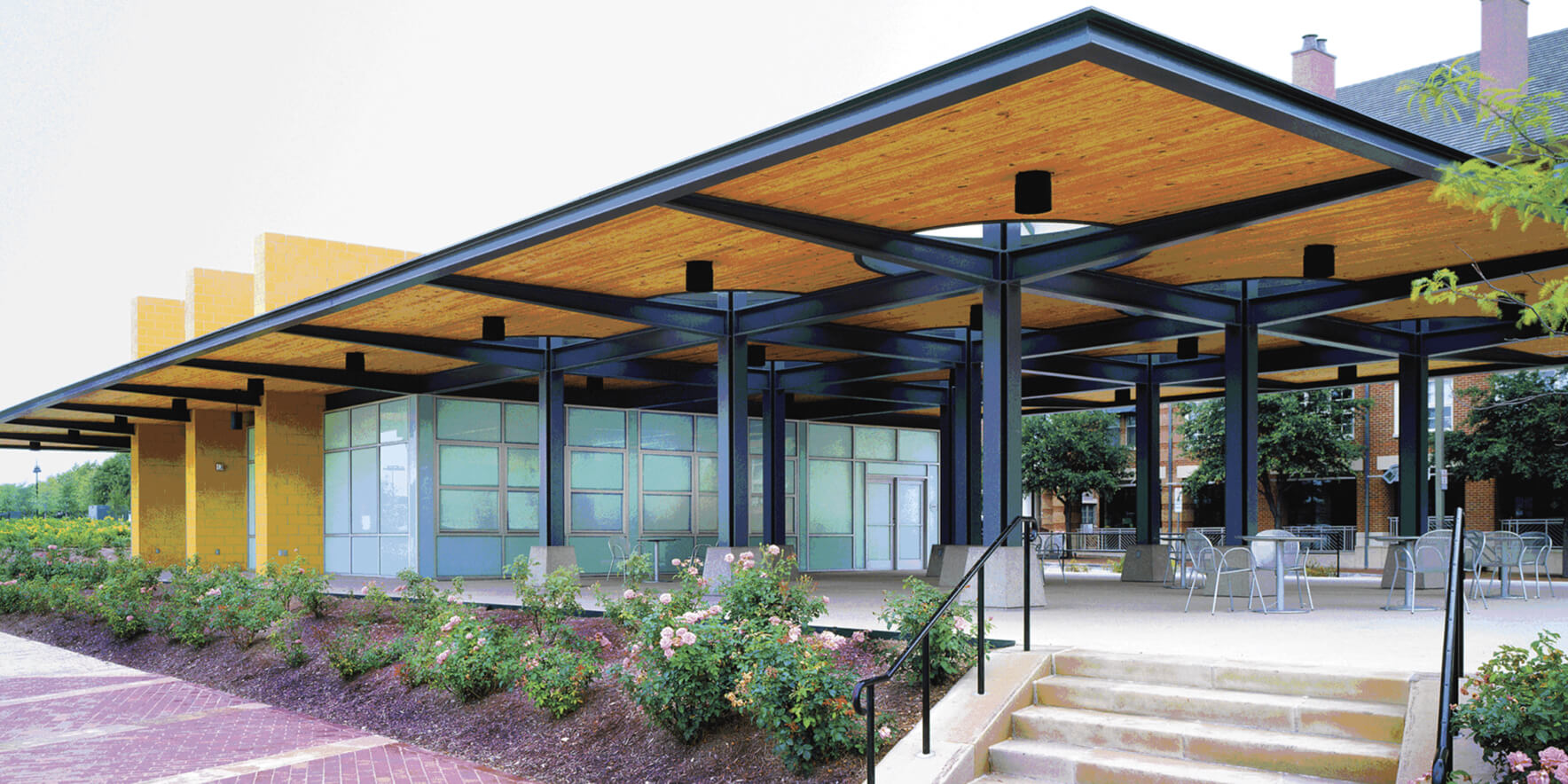The pavilion provides a covered outdoor space seating approximately 200 people, along with a catering kitchen and public restrooms. The project received multiple design awards, recognizing its architectural integration and civic value.